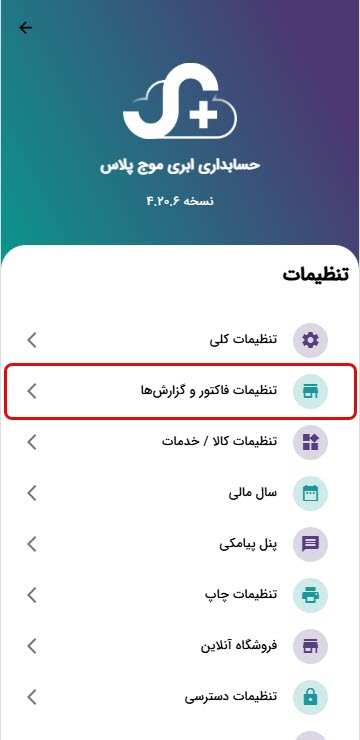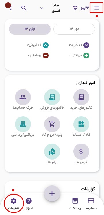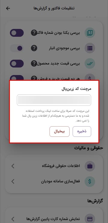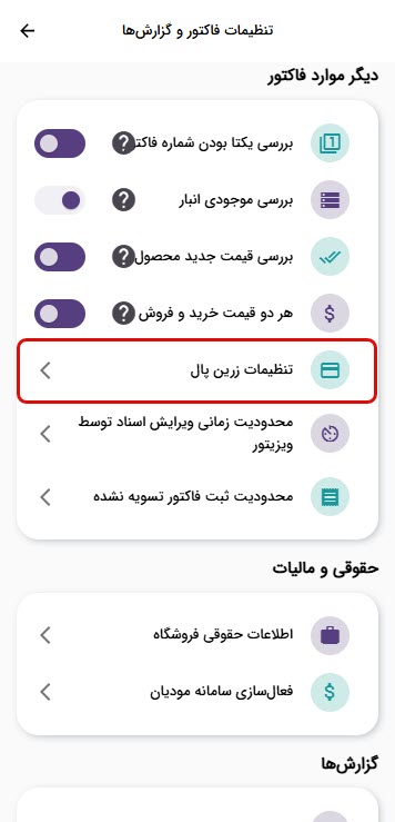 از صفحه اصلی برنامه  قسمت تنظیمات بخش تنظیمات فاکتور و گزارش ها تنظیمات زرین پال را انتخاب کنید و مرچنت کد زرین پال را ثبت نمایید.