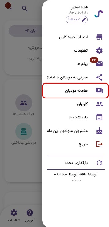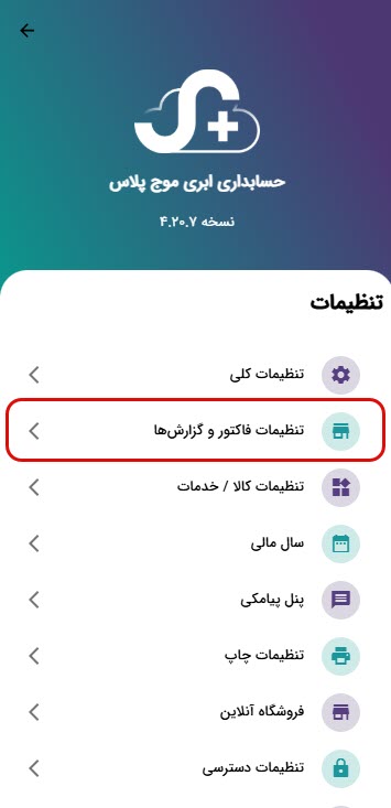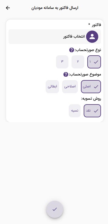 از صفحه اصلی برنامه موج پلاس سه خط بالا سمت راست گزینه سامانه مودیان را انتخاب کنید و فاکتورهای انتخابی را ارسال نمایید.