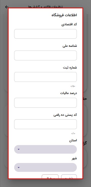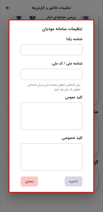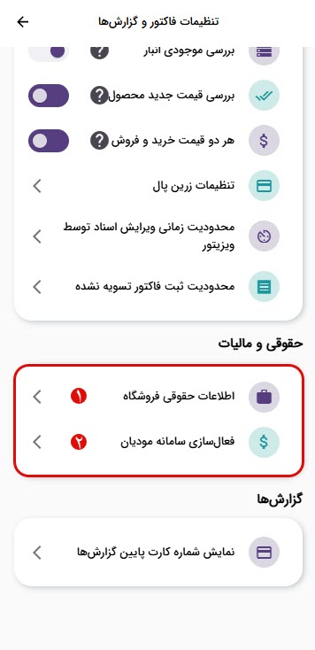 از قسمت تنظیمات برنامه موج پلاس بخش تنظیمات فاکتور و گزارش ها فیلد حقوقی و مالیات را تکمل نمایید که بخش اطلاعات حقوقی فروشگاه شامل کد اقتصادی و شناسه ملی و کد پستی می باشد و بخش فعالسازی سامانه مودیان شامل شناسه یکنا و کلید عمومی و کلید خصوصی می باشد.