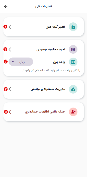 تنظیمات کلی برنامه شامل تغییر کلمه عبور، نحوه محاسبه موجودی، انتخاب واحد پول، مدیریت تراکنش‌ها و امکان حذف اطلاعات حسابداری می باشد.