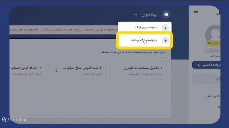بعد از تایید اطلاعات از طریق منوی سمت راست قسمت پیشخوان را انتخاب کرده تا مراحل ثبت نام نشان داده شود، مورد اول تکمیل مشخصات کاربری را انتخاب کرده و احراز هویت خود را انجام بدهید و درخواست درگاه پرداخت خود را ثبت کنید.