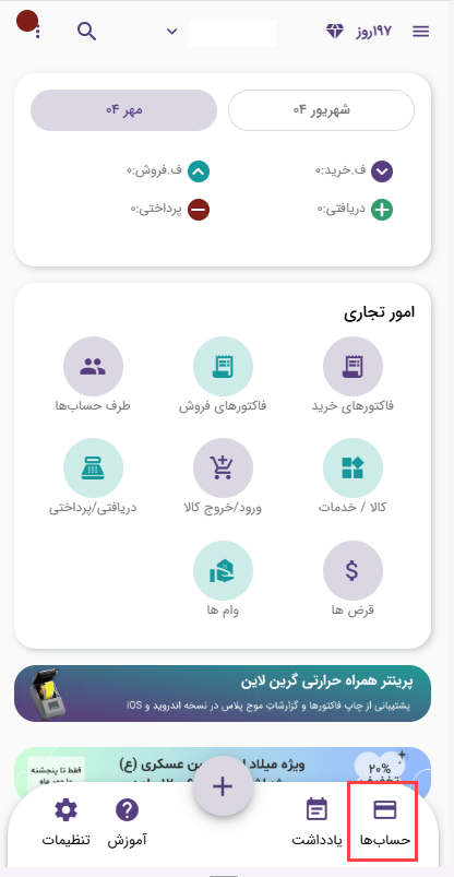 ابتدا در صفحه اصلی نرم افزار گزینه حساب ها را انتخاب کنید: