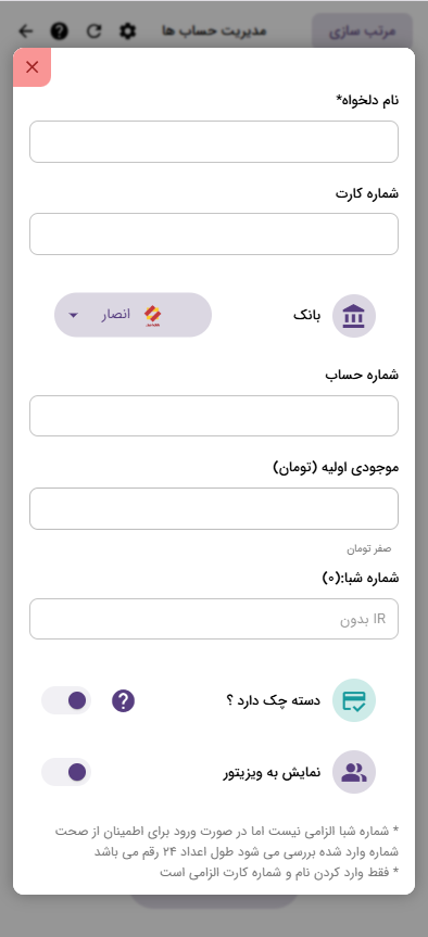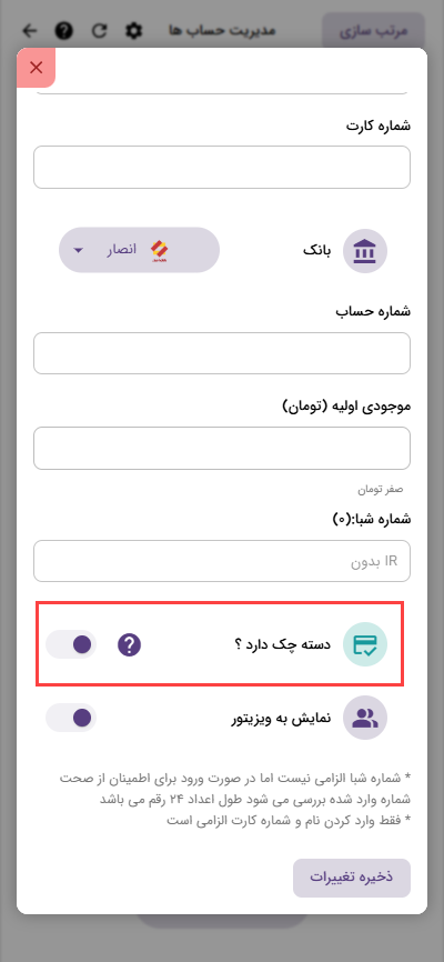 اگر حسابی که ایجاد میکنید دسته چک داشته باشد باید گزینه ‌”دسته چک دارد؟” را فعال کنید تا بتونید سند های پرداختی از نوع چک برای این حساب فعال کنید.