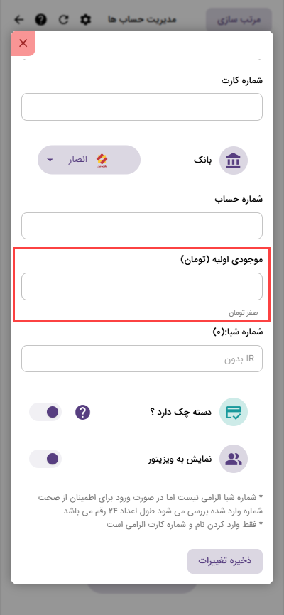 طبیعتا هر حسابی که ایجاد می کنید یک موجودی اولیه دارد که میتونید در قسمت “موجودی اولیه” وارد کنید.