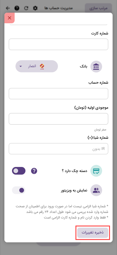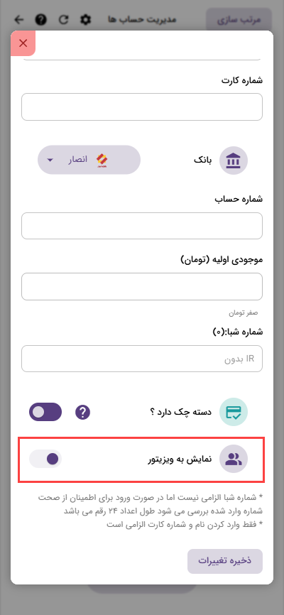 اگر تمایل داشتید که این حساب به ویزیتور هم نمایش داده شود گزینه “نمایش به ویزیتور” را فعال کنید.