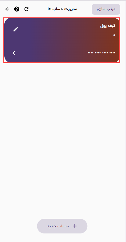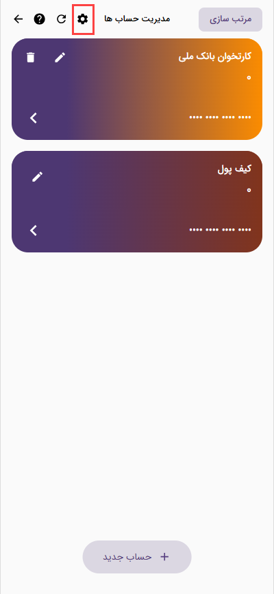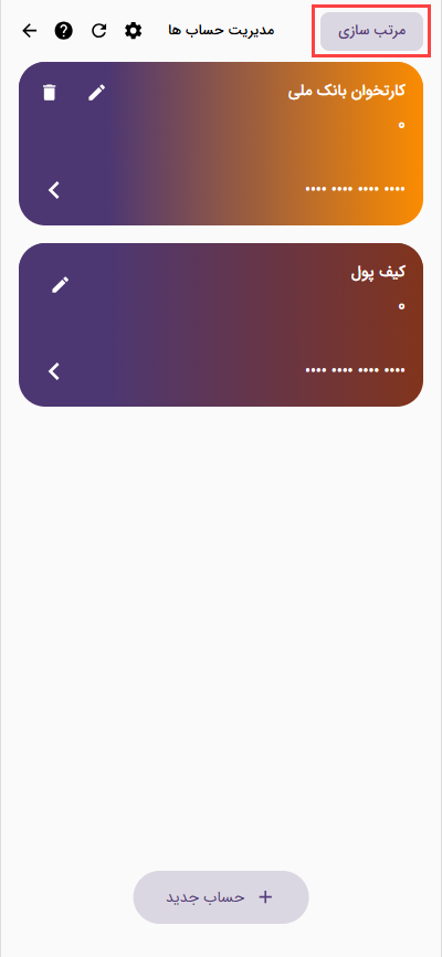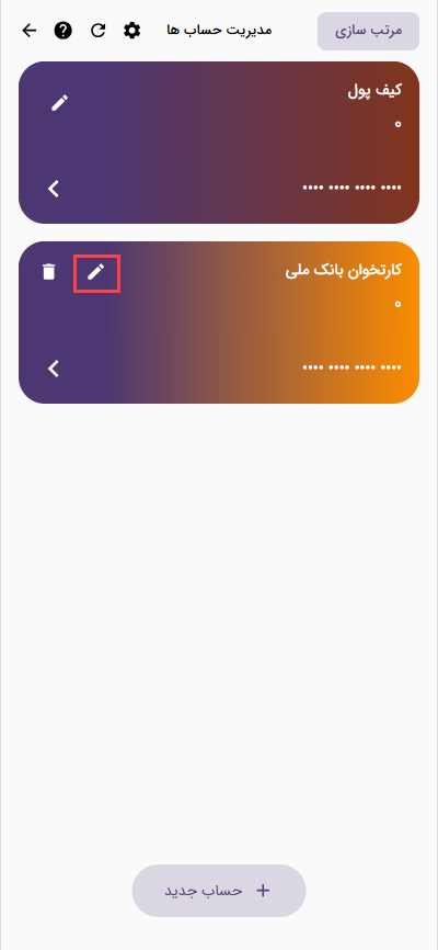برای ویرایش و یا تکمیل هر حساب میتونید از آیکون مداد روی هر کارت استفاده کنید.