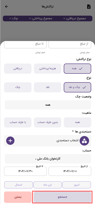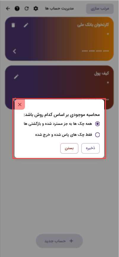 اگر تمایل داشته باشید حسابی که تعریف کردید با حساب واقعی همخوانی داشته باشد، بهتر است وضعیت را روی فقط چک های پاس شده و خرج شده قرار دهید تا در صورت پاس شدن چک و یا خرج شدن چک محاسبه شود. اما اگر در یک نگاه کلا بخواهید بدانید در یک مدت خاص با احتساب همه چک های درجریان موجودی حساب چقدر میشود، میتوانید از گزینه همه چک ها به جز مسترد شده و بازگشتی ها قرار دهید.